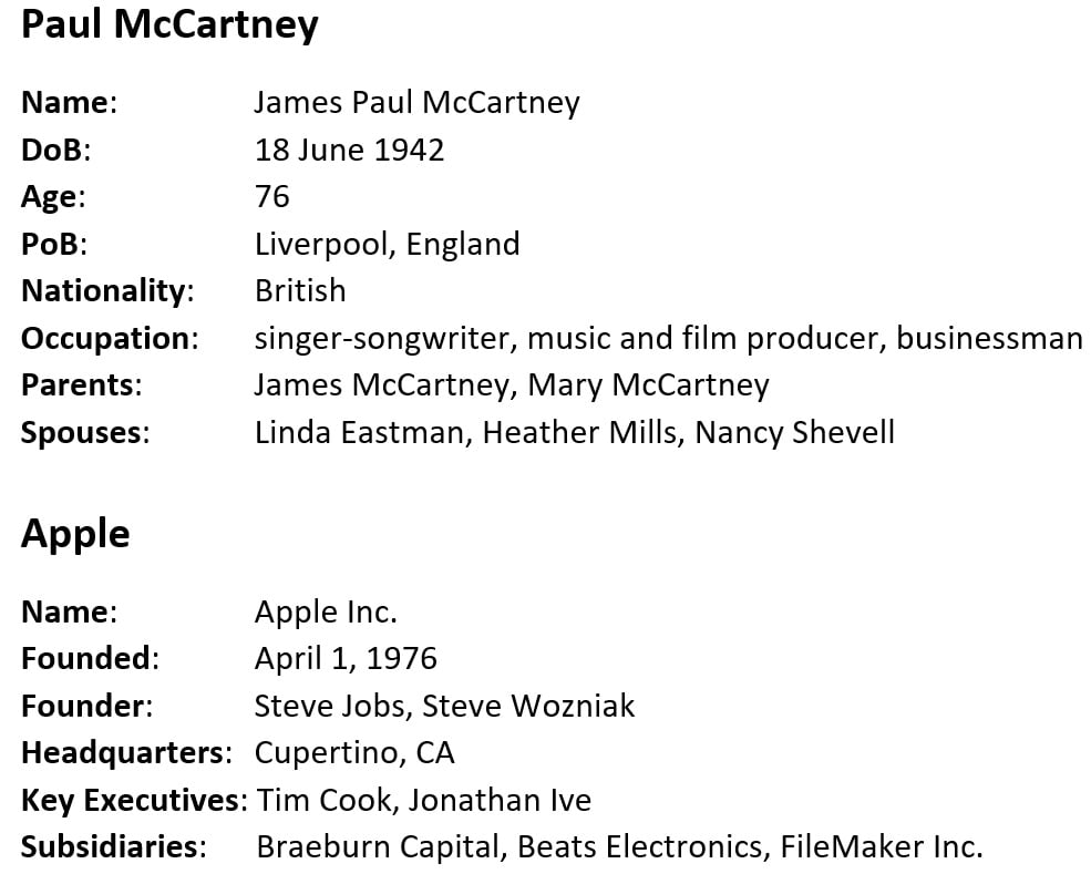 Biographical information is quite common across the Internet. An example would be Wikipedia’s infoboxes. Here’s some sample biographical information for Paul McCartney and Apple: